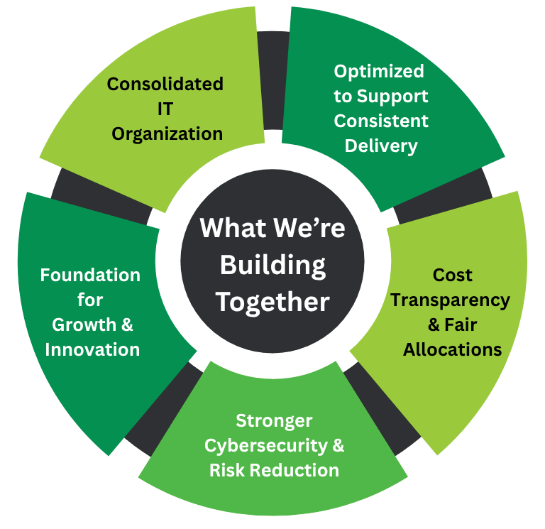 We are building a stronger, shared IT foundation that will give us the scale, expertise, and consistency needed to modernize, secure, and grow. This means investing in modern laptops and cloud tools, accelerating the adoption of AI and emerging technology, strengthening our cybersecurity, standardizing networks and collaboration platforms, and creating clear career paths across IT.